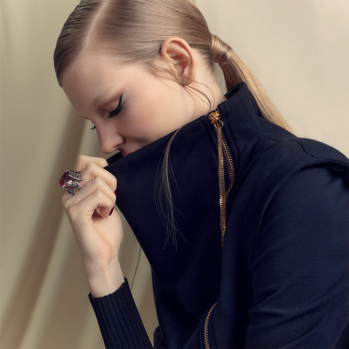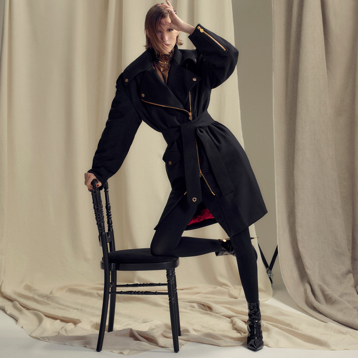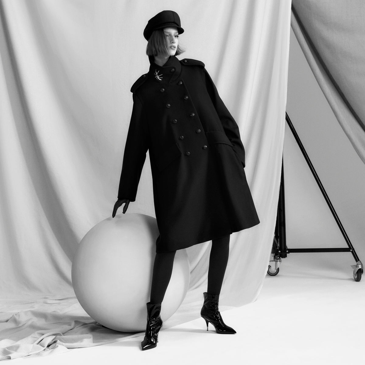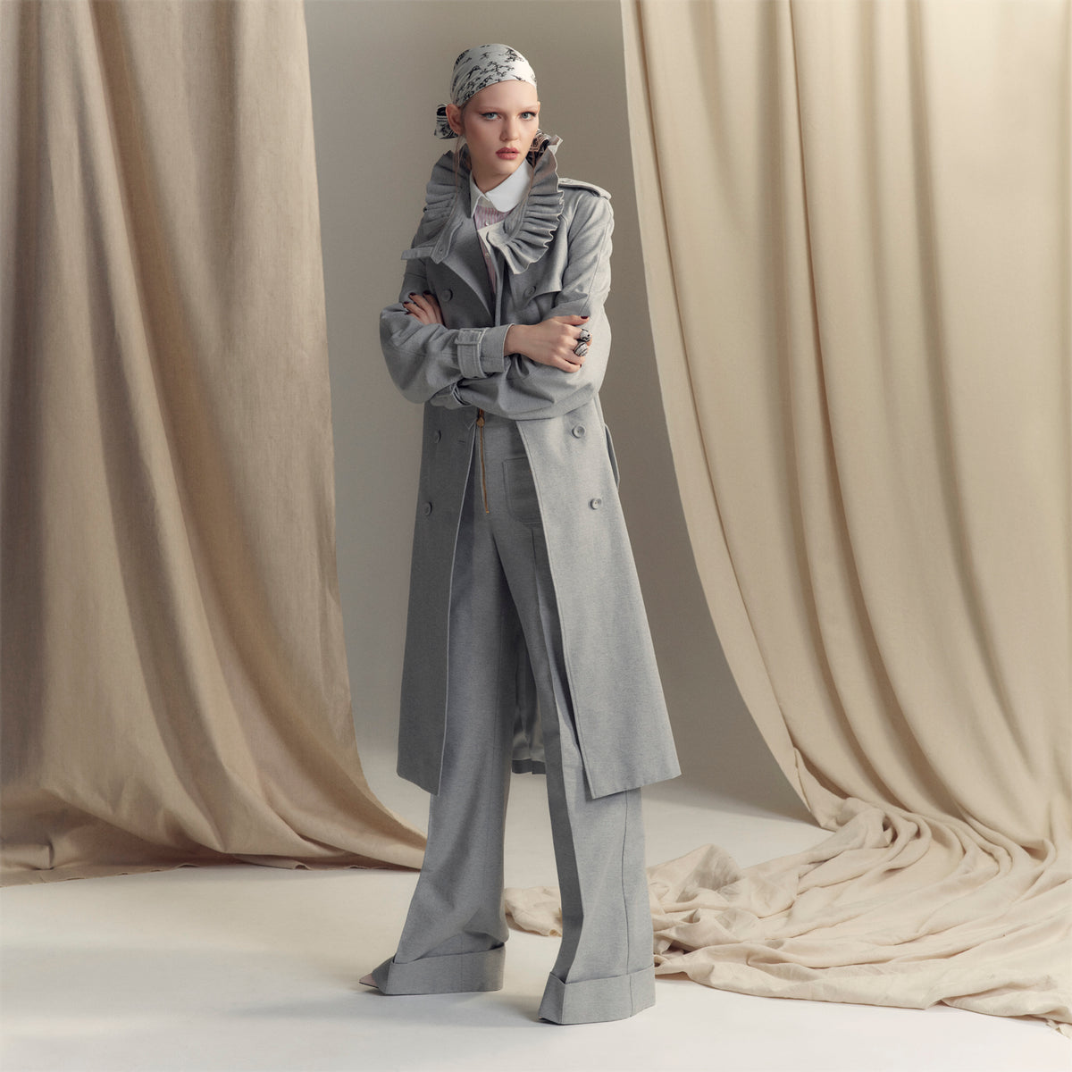Boldness and impertinence are found in certain prints, in the diversion of bourgeois themes such as a loden which is adorned with a ruffled Medici collar and a leather collar with very “rock'n'roll” accents, or, conversely, a very “biker” perfecto which becomes an oversized cashmere coat, equipped with zips and gold snap buttons… A “Toile de Jouy” print, directly inspired by the bedrooms of little girls who are heirs of the Countess of Ségur, hide proud amazons dressed in Plum Goldschmidt, riding their motorcycles between the landscapes of these idyllic countryside...