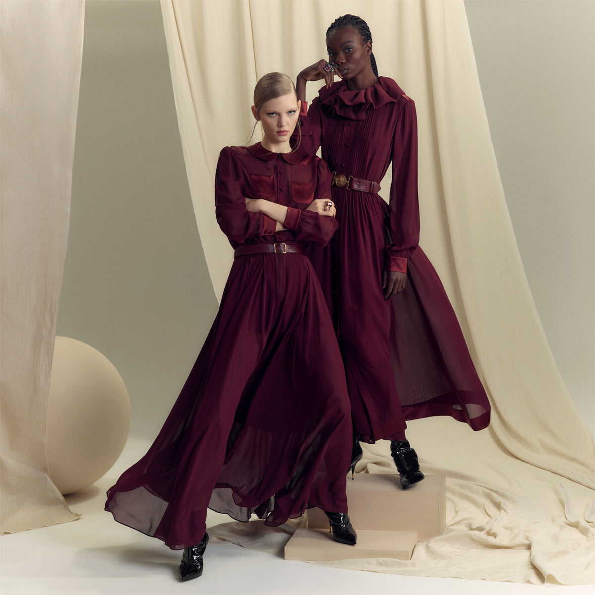 The colors are bright and bold. Poppy red for passion, powdery pastels for softness (hydrangea pink, jade green), bottle green and ink blue for the twisted classics, plum color of course for the iconic color of the House, black for its strength graphic and for a few bursts of light: white, amber and gold.
