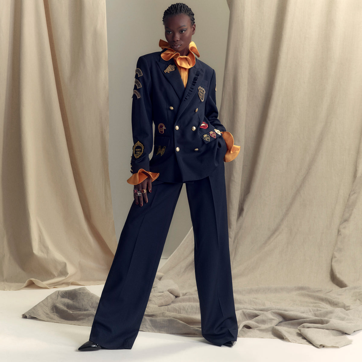 Everything is enriched with these little details that make all the difference: small covered buttons, a couture nod in reference to children's fashion, a newborn bracelet attached to the wrist of a wise blouse, reminiscent of rapper bracelets , engraved snap buttons and eyelets inspired by piercings, strict navy blazer covered with patches and badges like a “biker” perfecto.