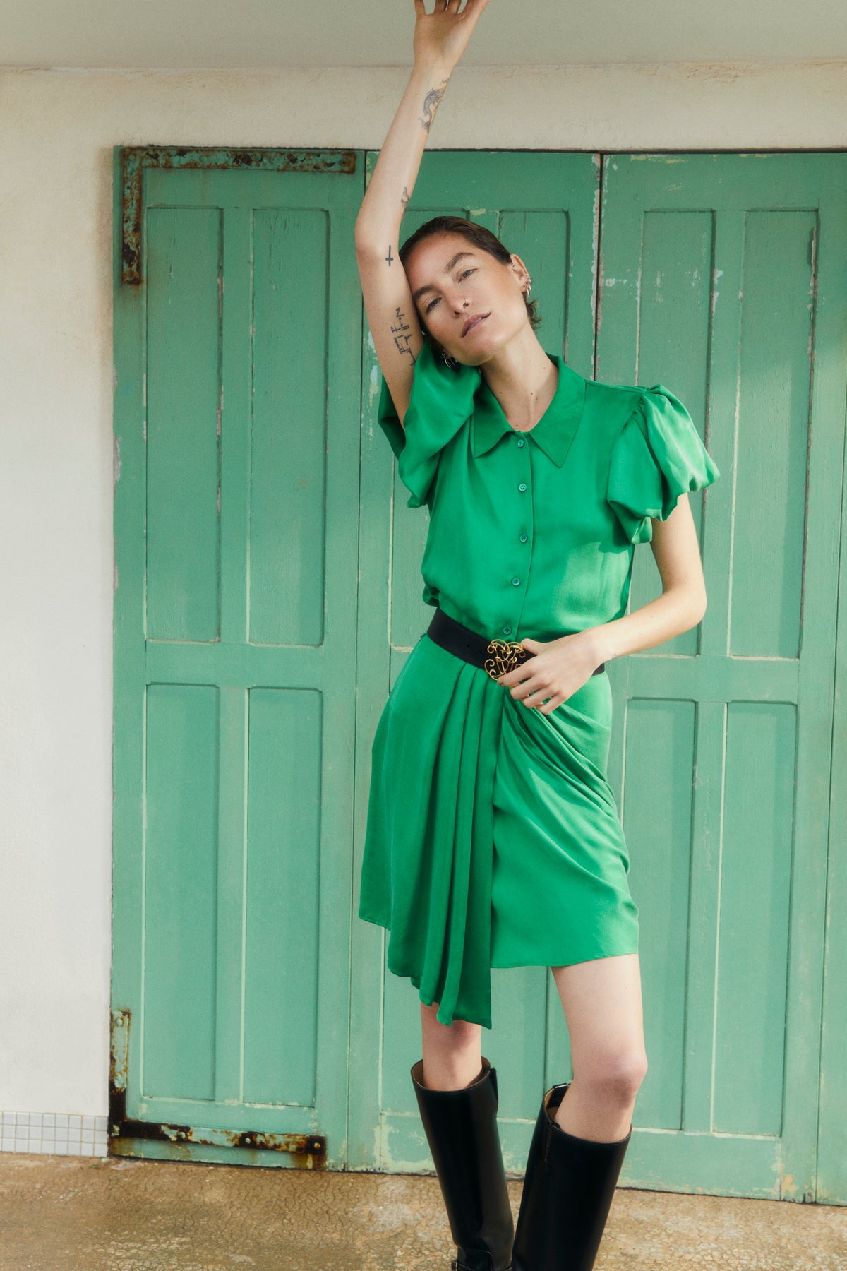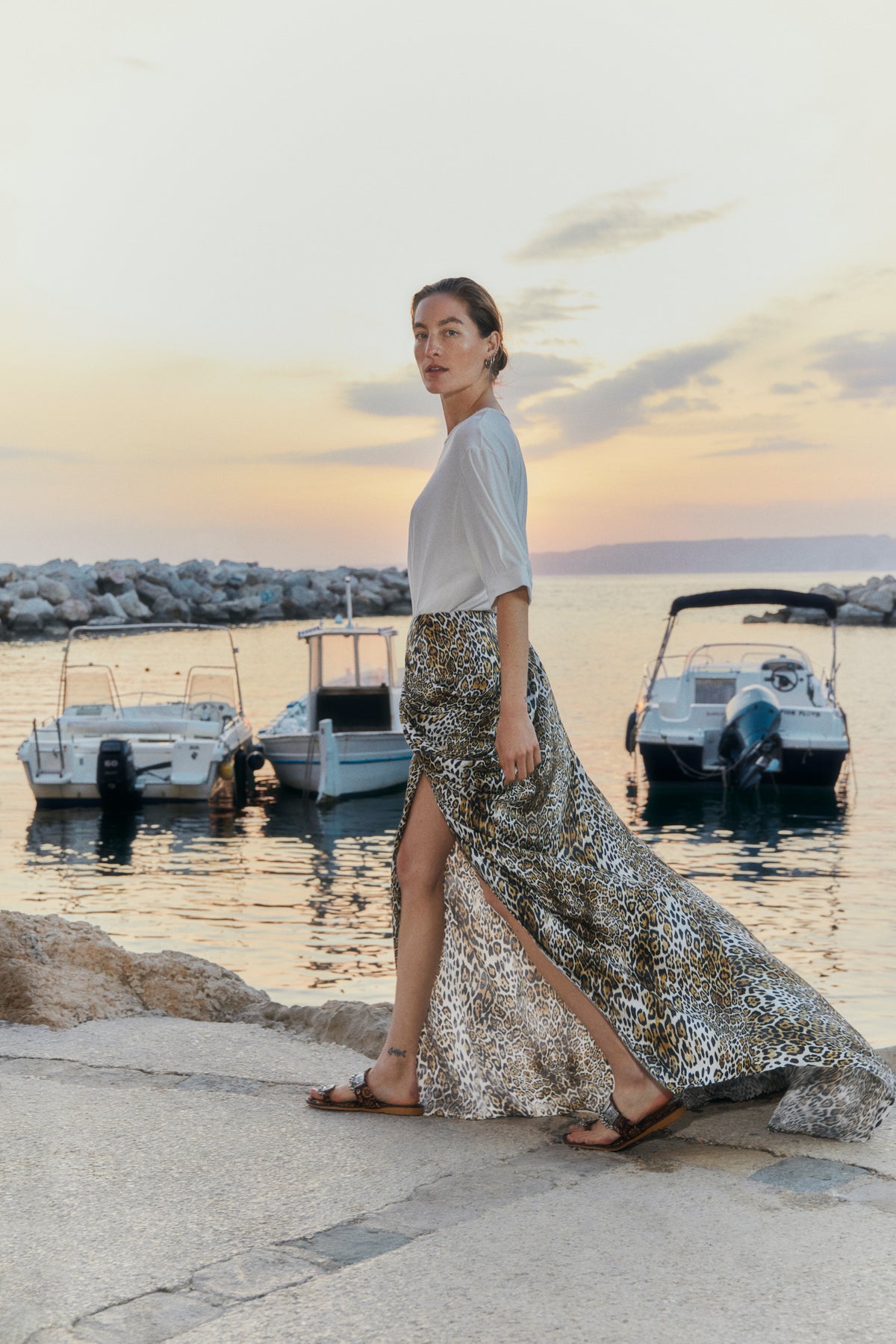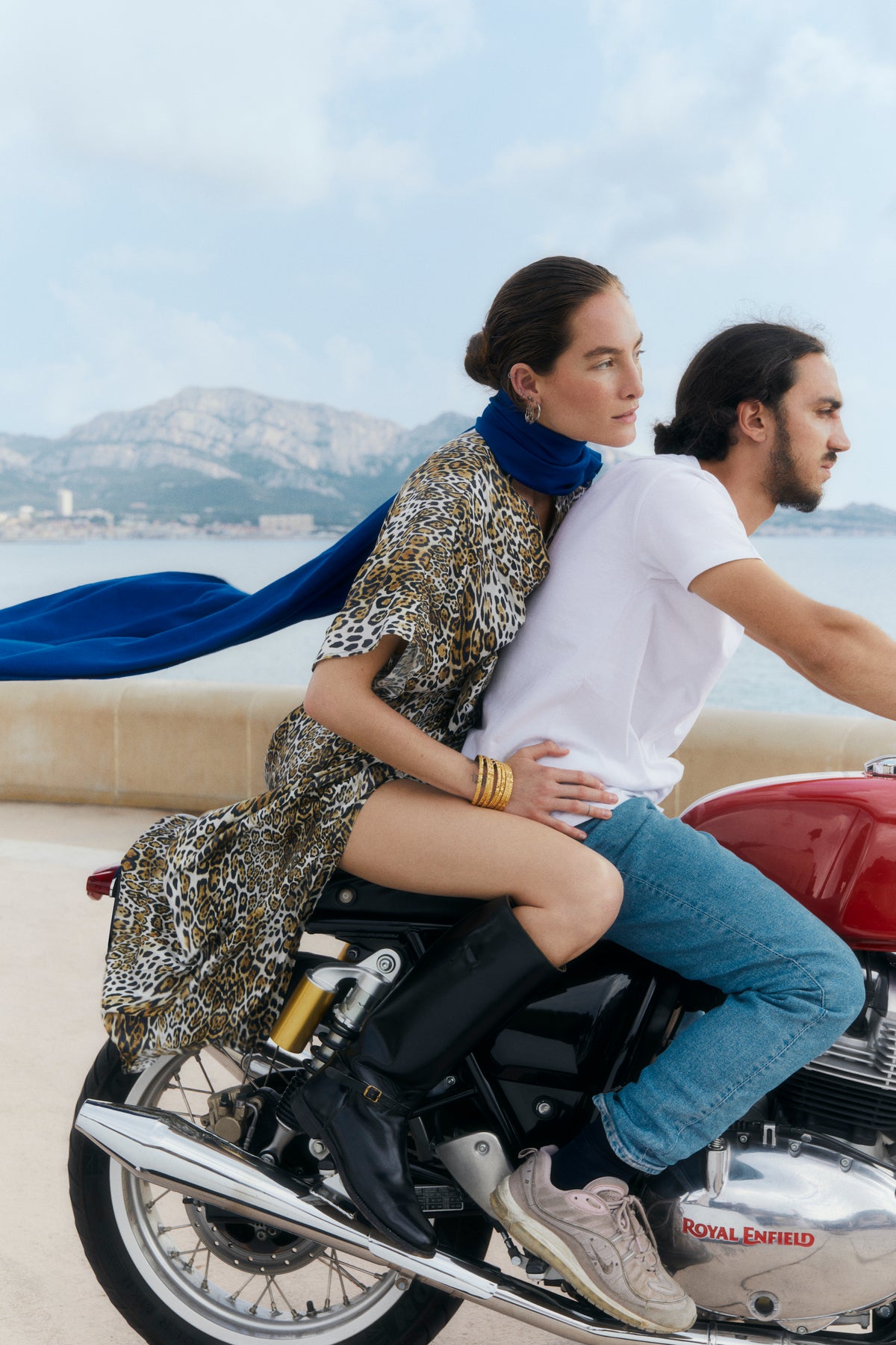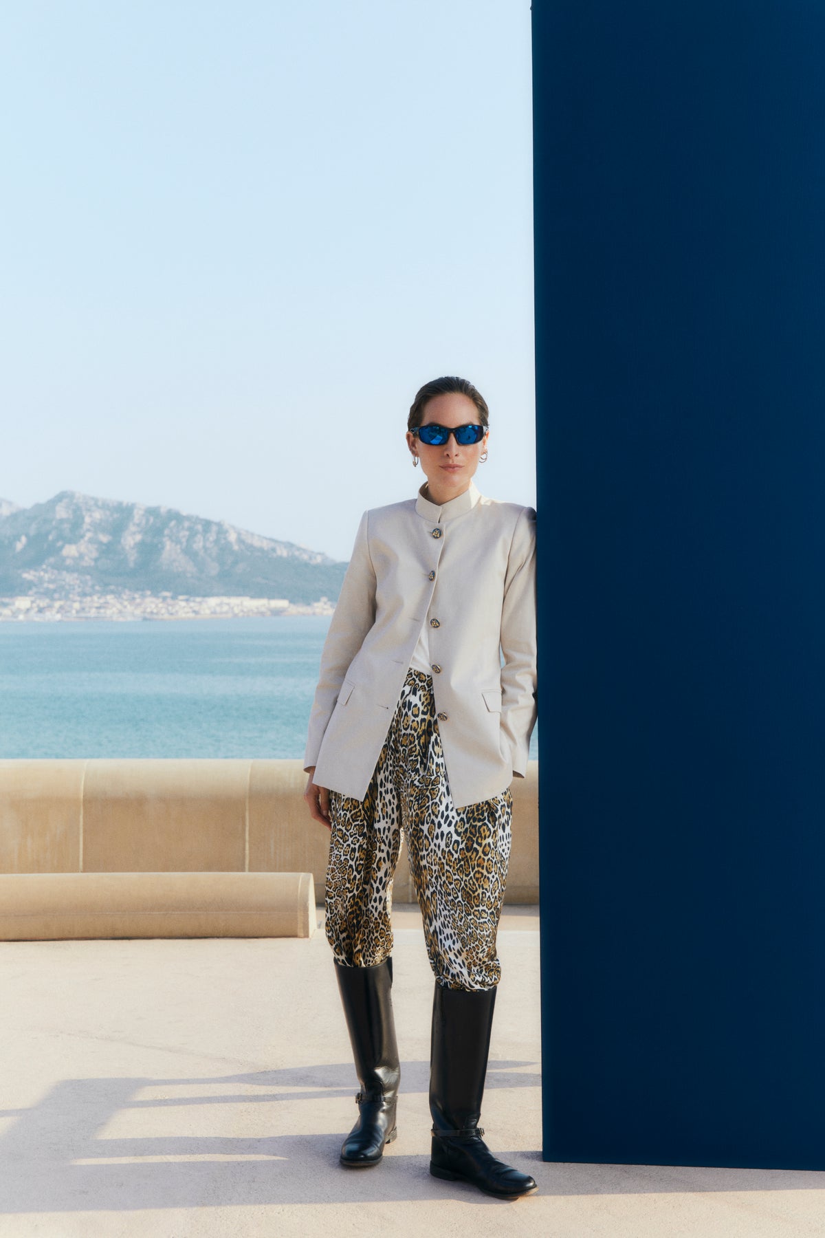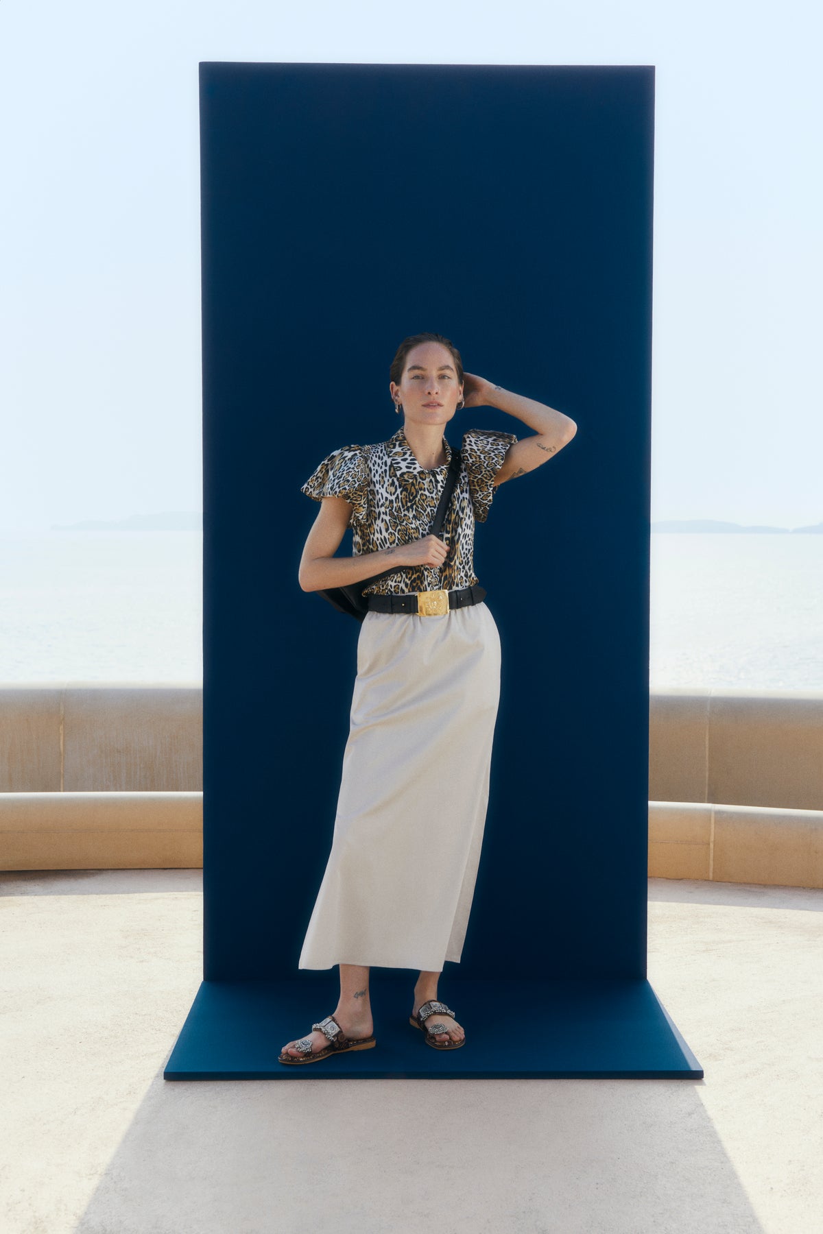 Bows and puffed sleeves contrast with tunic-trouser shapes, baby doll uniforms and “palace” pajamas. The materials chosen — silk, cotton, and linen, with a touch of viscose for fluidity — exalt graphic, corolla and columnar volumes that are always in motion. Sari-like draping, youthful blouses, military-inspired tunic jackets and jodhpurs merge in a whirlwind of crisp poplin, giant dahlia floral silk crepe; sensual and naturalistic lamé leopard print, and "Oasis"light cotton sateen to create an ethereal and layered silhouette.