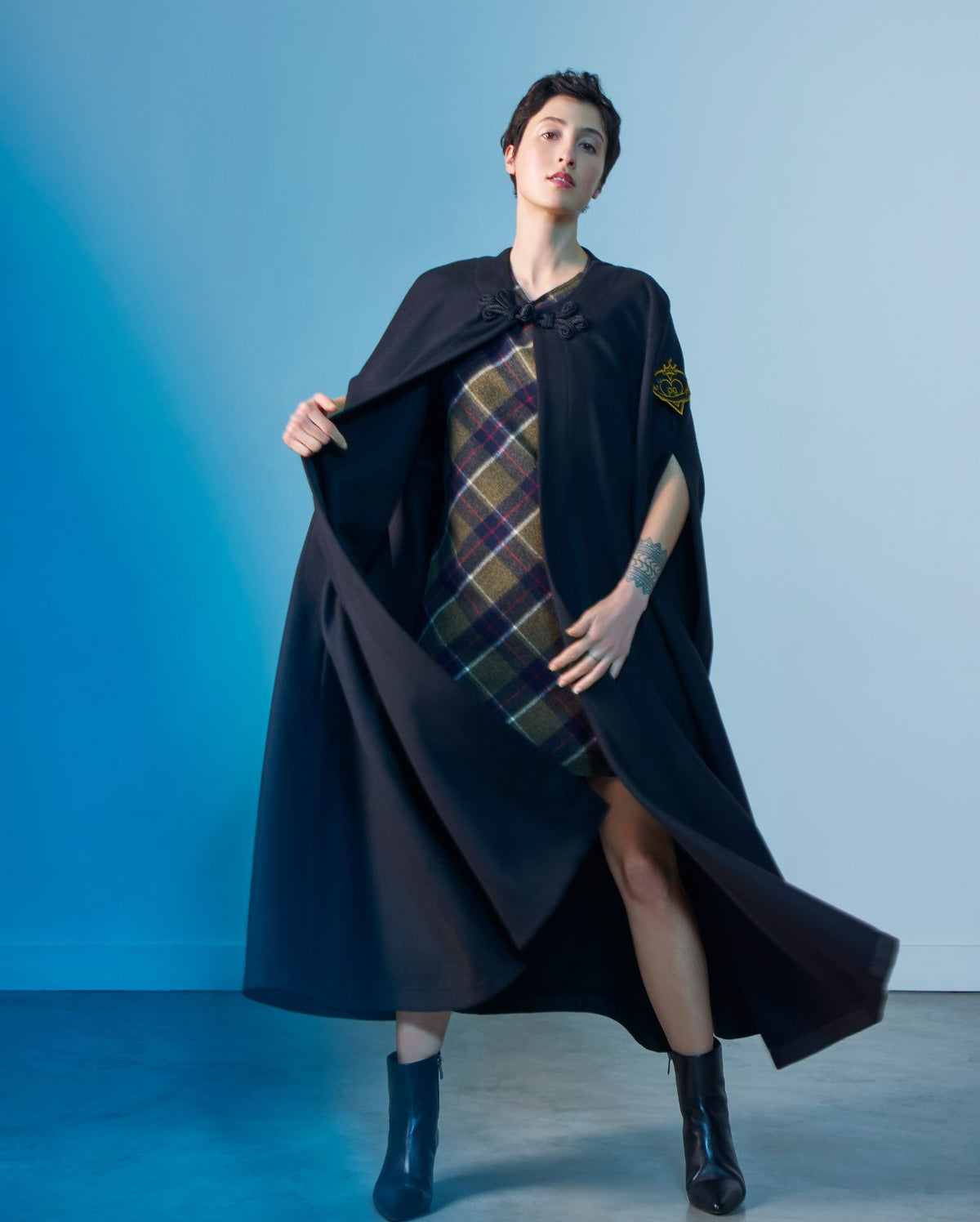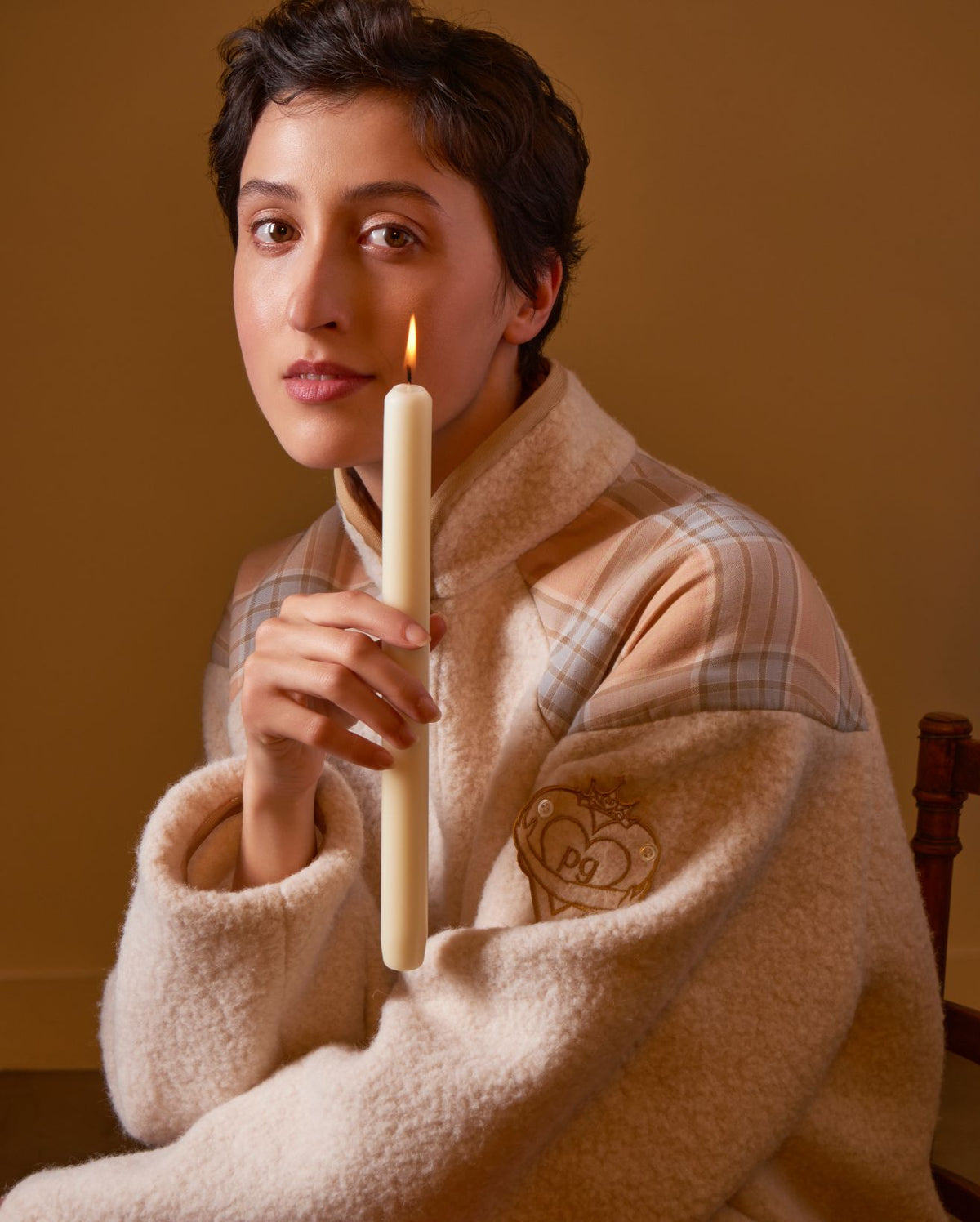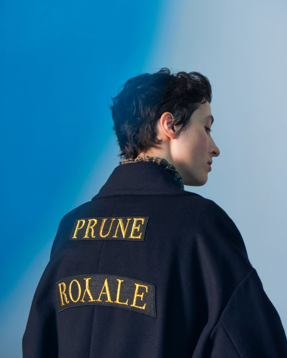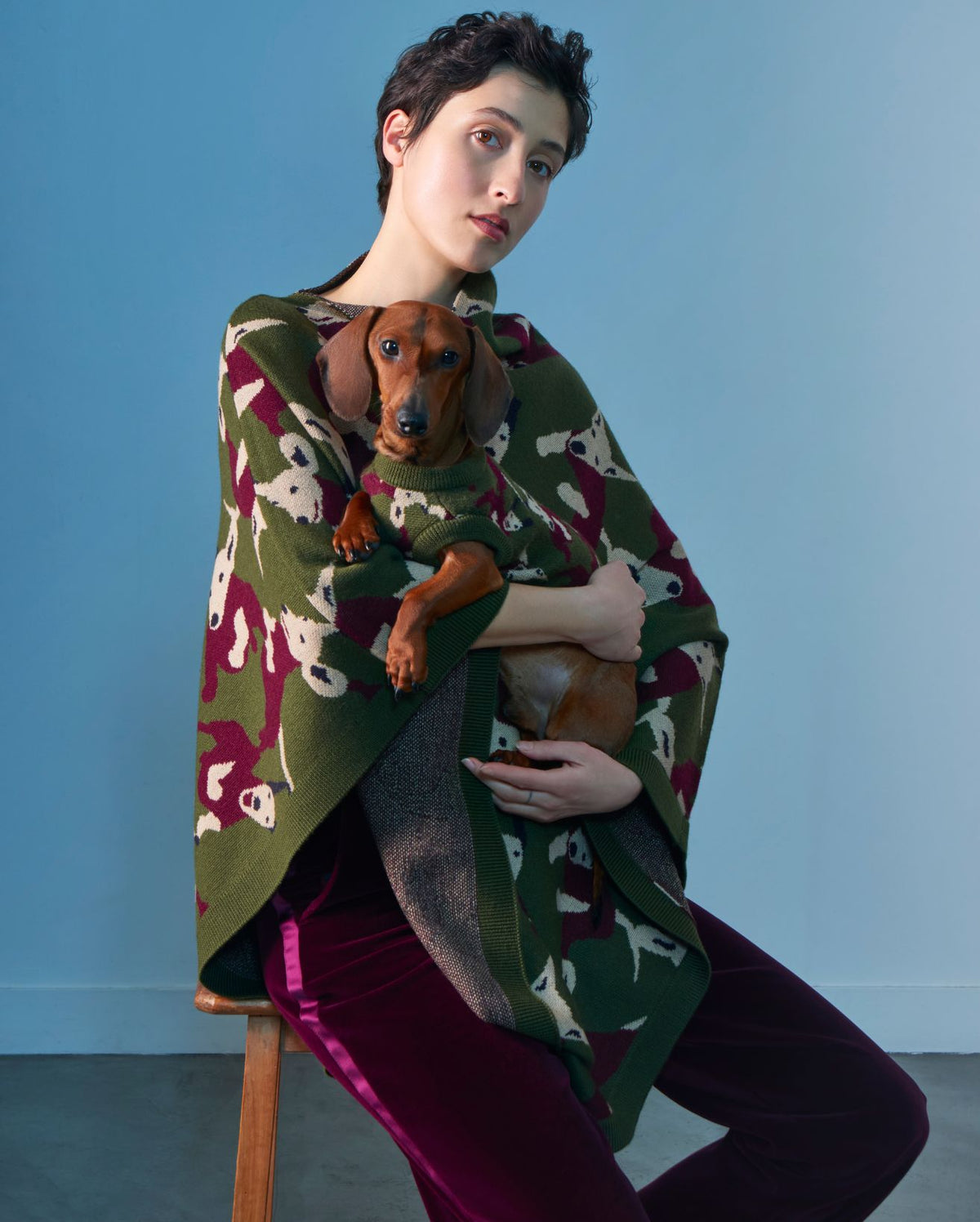 La maille jacquard en laine mérinos extrafine se teinte, quant à elle, de rêves scandinaves. On y devine Valentino, le fidèle teckel de la créatrice, s’envolant vers son monde imaginaire au cœur de la constellation Prune Goldschmidt, clin d’œil tendre à l’univers poétique de J.M. Barrie.