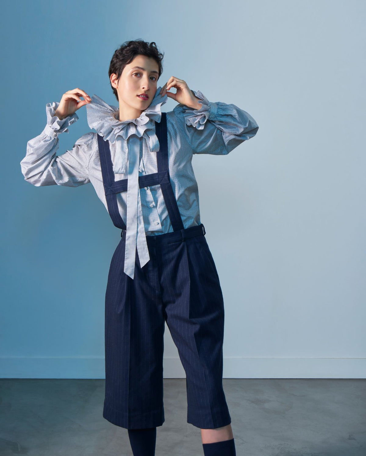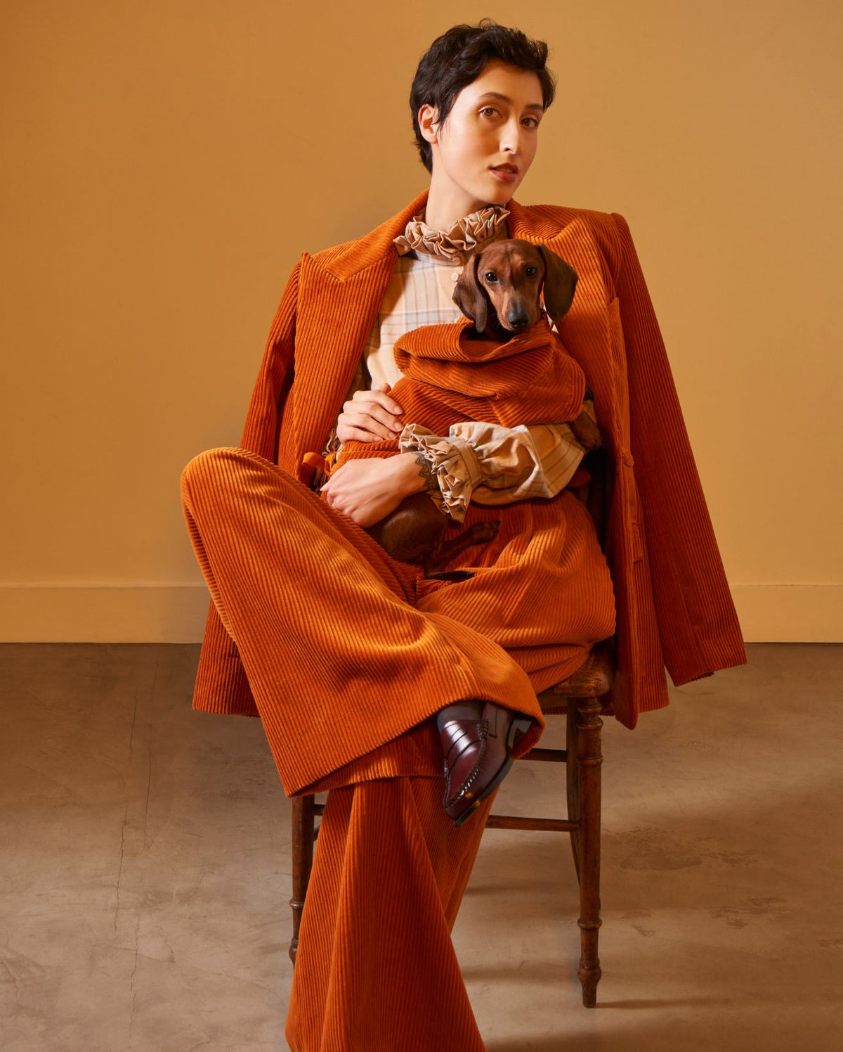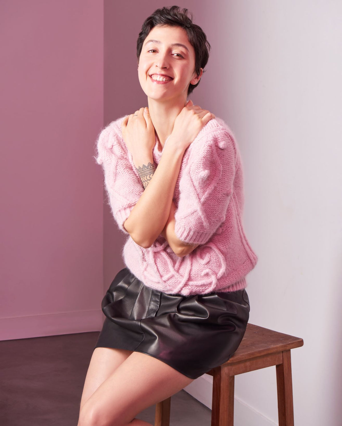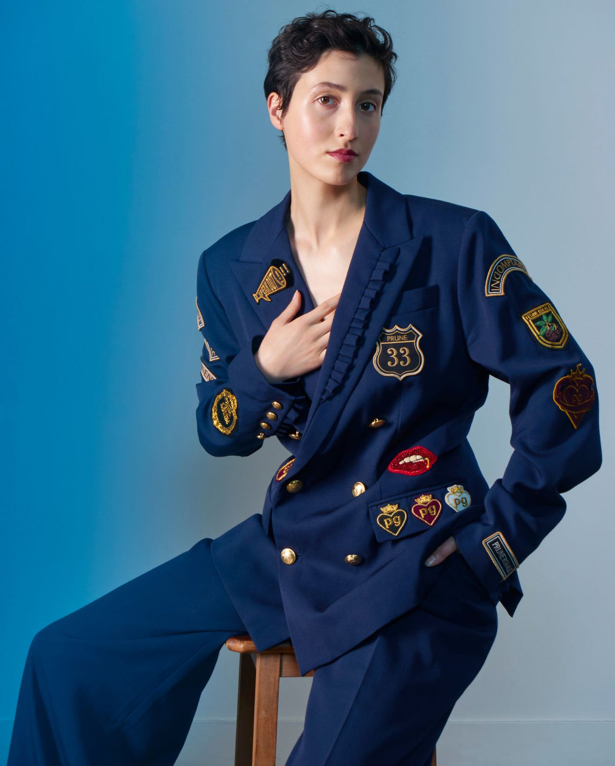 La maille jacquard en laine mérinos extrafine se teinte, quant à elle, de rêves scandinaves. On y devine Valentino, le fidèle teckel de la créatrice, s’envolant vers son monde imaginaire au cœur de la constellation Prune Goldschmidt, clin d’œil tendre à l’univers poétique de J.M. Barrie.