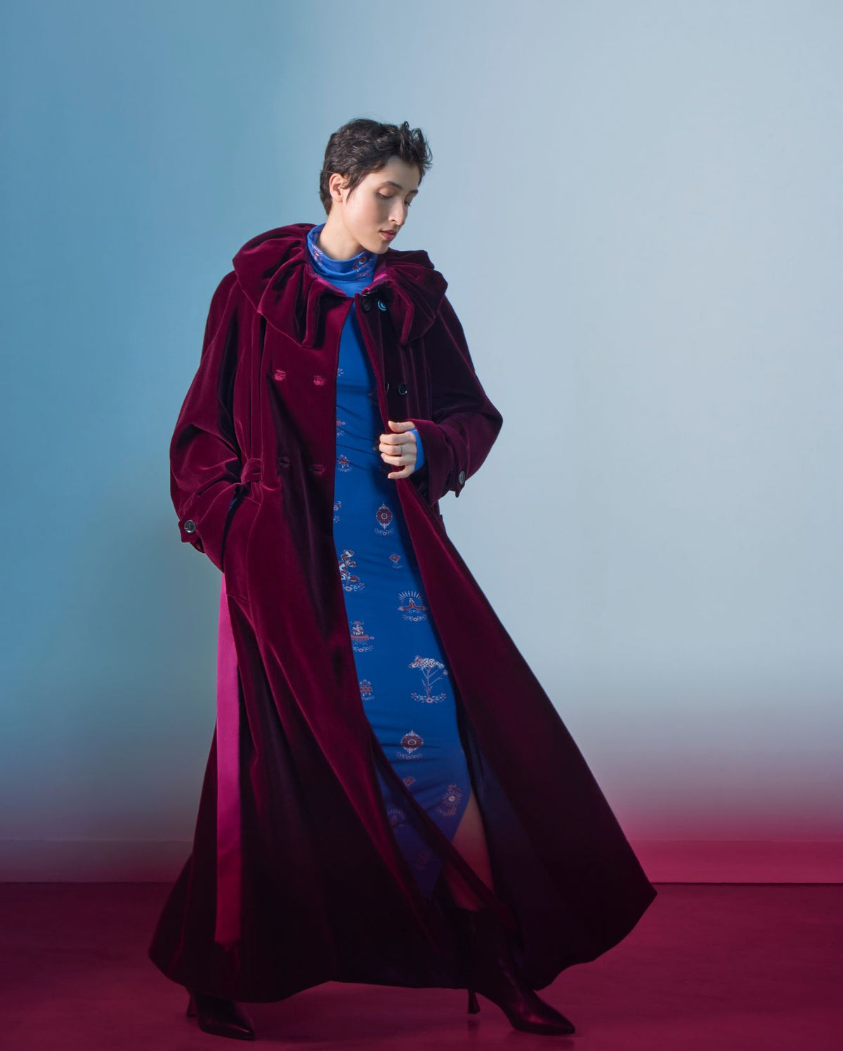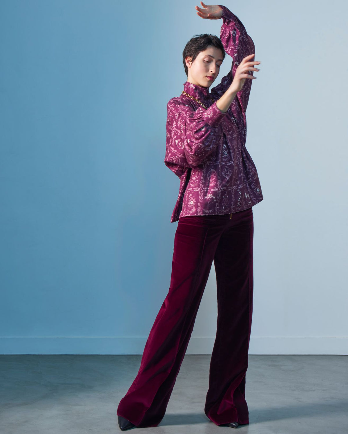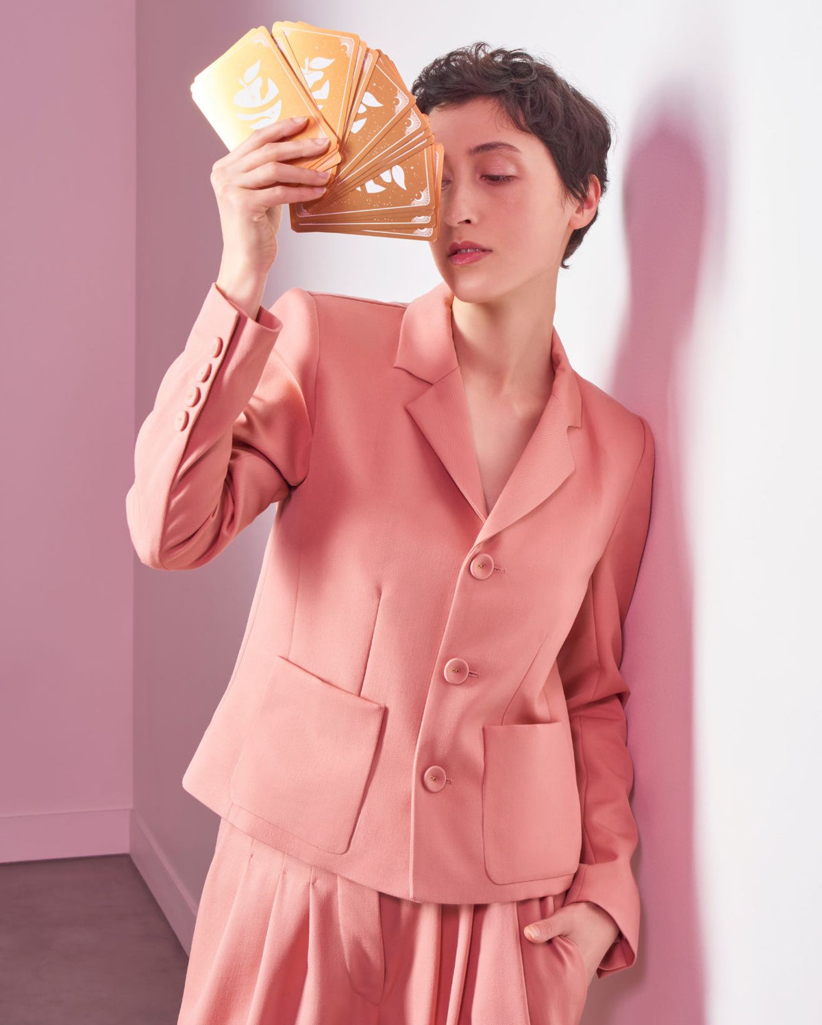 L’imprimé principal, Oracle, puise son essence dans la dimension spirituelle et introspective de la créatrice. Tel un jeu divin de cartes à tirer, il se déploie en un patchwork de fleurs, de symboles et de messages inspirants, évoquant la cartomancie et la quête d’intuition. Ce motif rassemble vingt vertus chères à Prune — de la magie d’une constellation à la douceur d’un baiser, de la tendresse d’une fleur à la force de l’enfant intérieur. Imprimé sur un twill de laine-viscose souple et réconfortant, dans un prune profond inspiré du septième chakra, le chakra Couronne, il symbolise la conscience pure, le lien au cosmos et à l’infini. Porter cet imprimé, c’est s’ouvrir à une introspection féminine et à une élévation spirituelle.