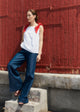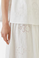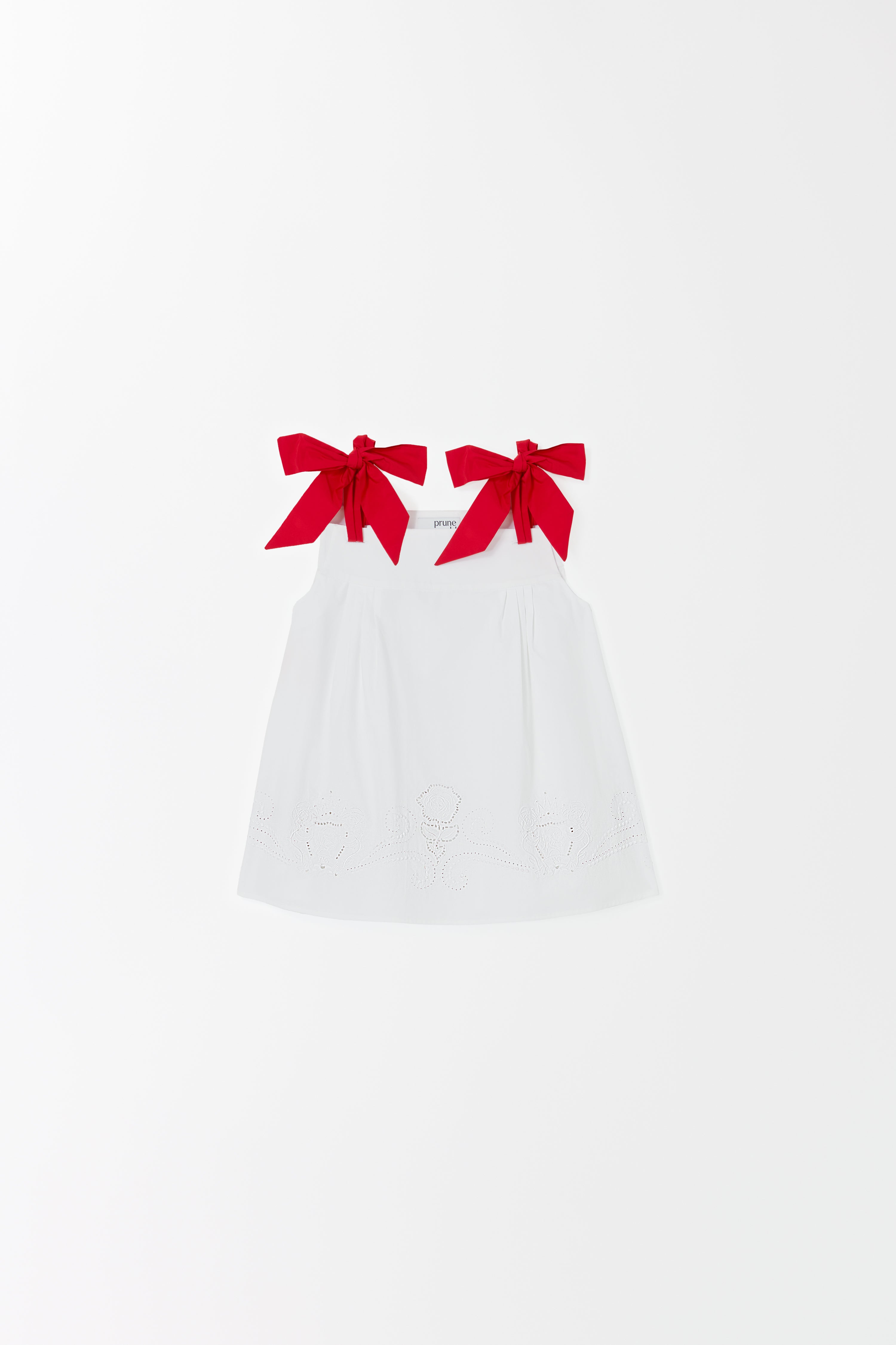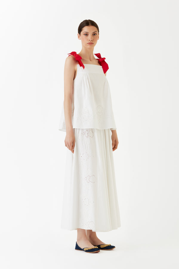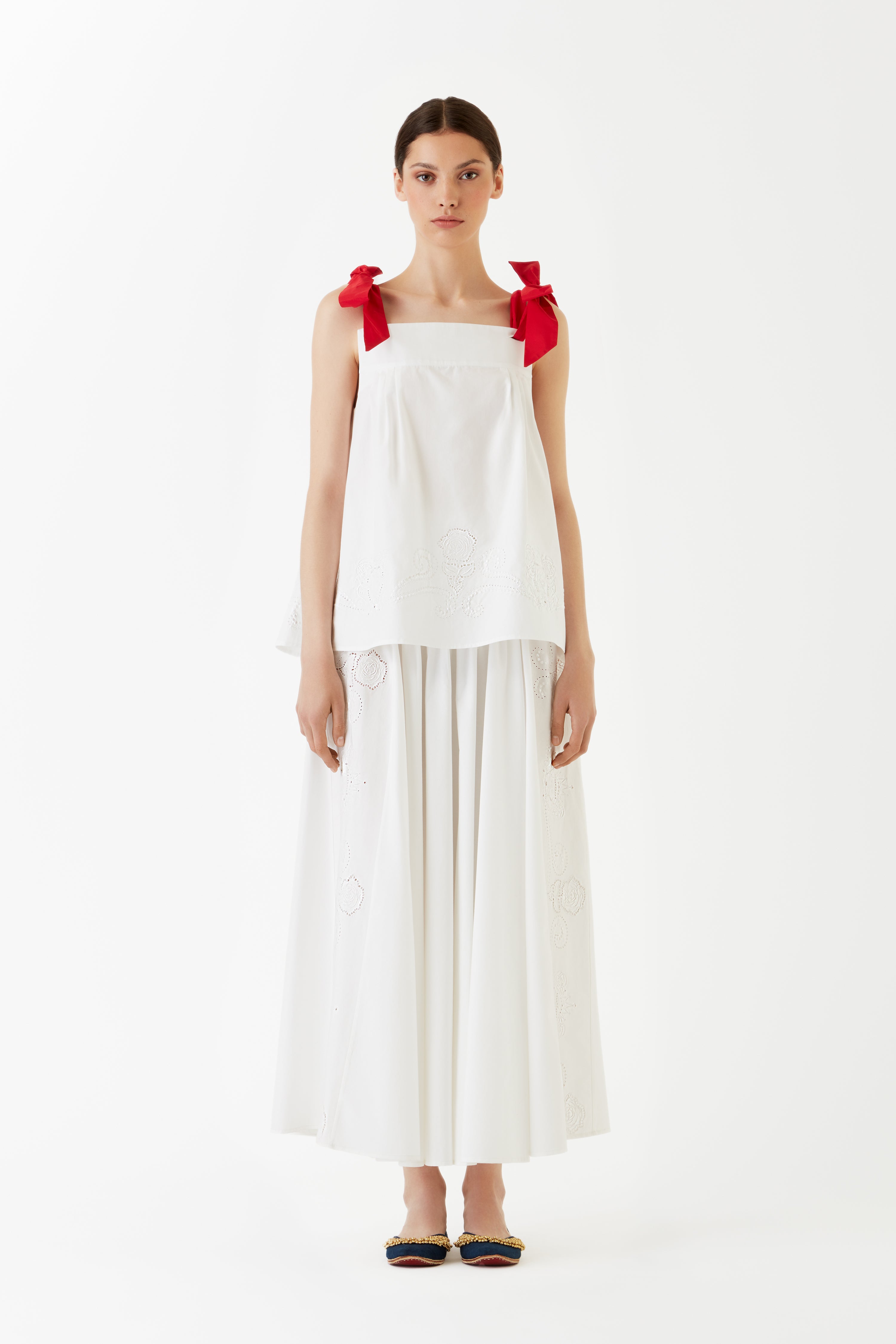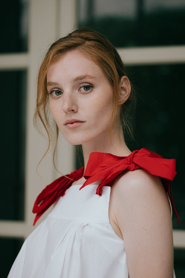 Les bretelles rouges nouées sur les épaules apportent une touche de couleur, de peps et de féminité à ce modèle immaculé. Le bas du top est orné de broderies ajourées raffinées qui reprennent le blason emblématique de la collection : une représentation de la créatrice tenant le rôle de la Reine de Cœur dans le conte "Alice aux Pays des Merveilles", un monde poétique et fantaisiste qui lui est cher.